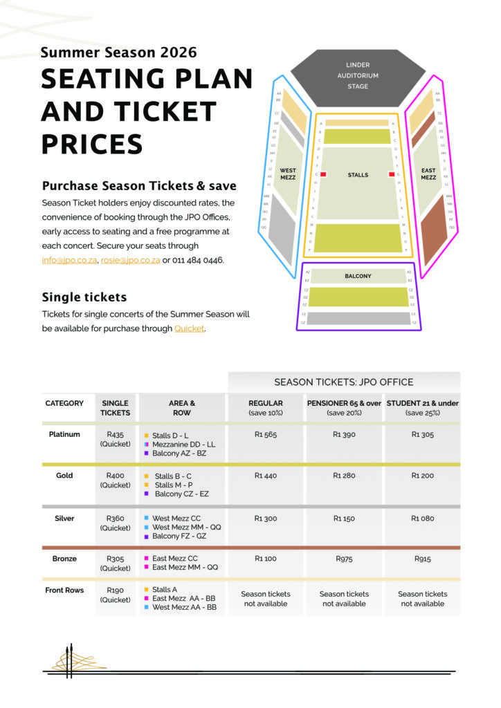 Secure your spot for this extraordinary musical journey. Season tickets are available via info@jpo.co.za or 011 484 0446. Single concert tickets are available via Quicket. Please note: no under-5s are allowed. Accessible parking and wheelchair seating are available; contact the JPO for assistance with your booking.